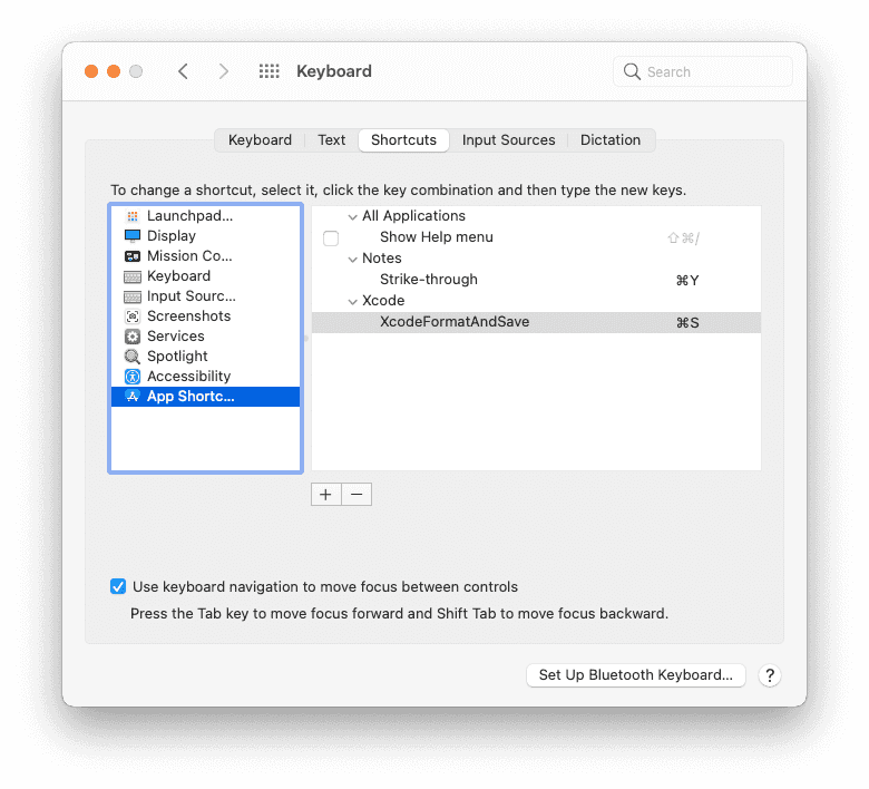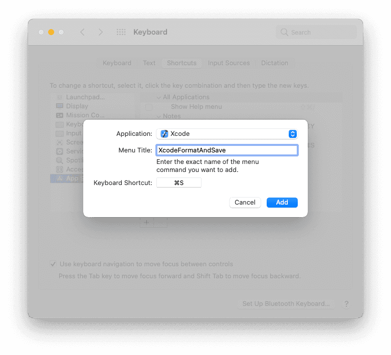 Go to "System Preferences" > "Keyboard" and pick the "Shortcuts" tab. On the sidebar, select "App Shortcuts". Add a new shortcut, the "Application" is XCode, the "Menu Title" is the name of our Quick Action (in my case XcodeFormatAndSave), and the "Keyboard Shortcut" is Cmd+S!