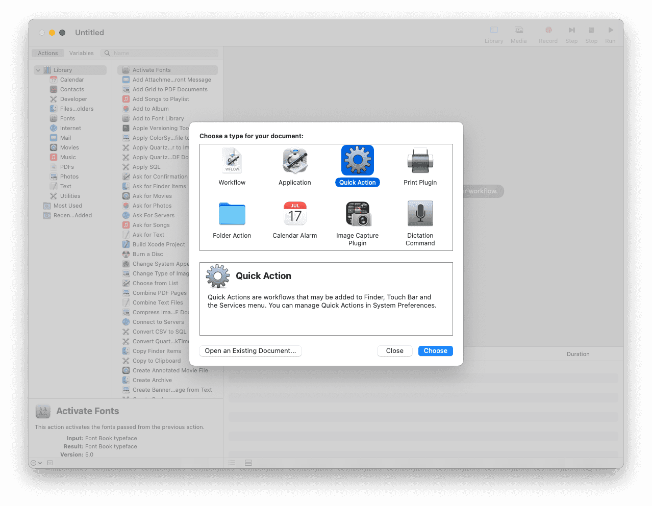 Here is how the Quick Action looks. I've changed the "Workflow receives" to "no input" and "in" to "Xcode".