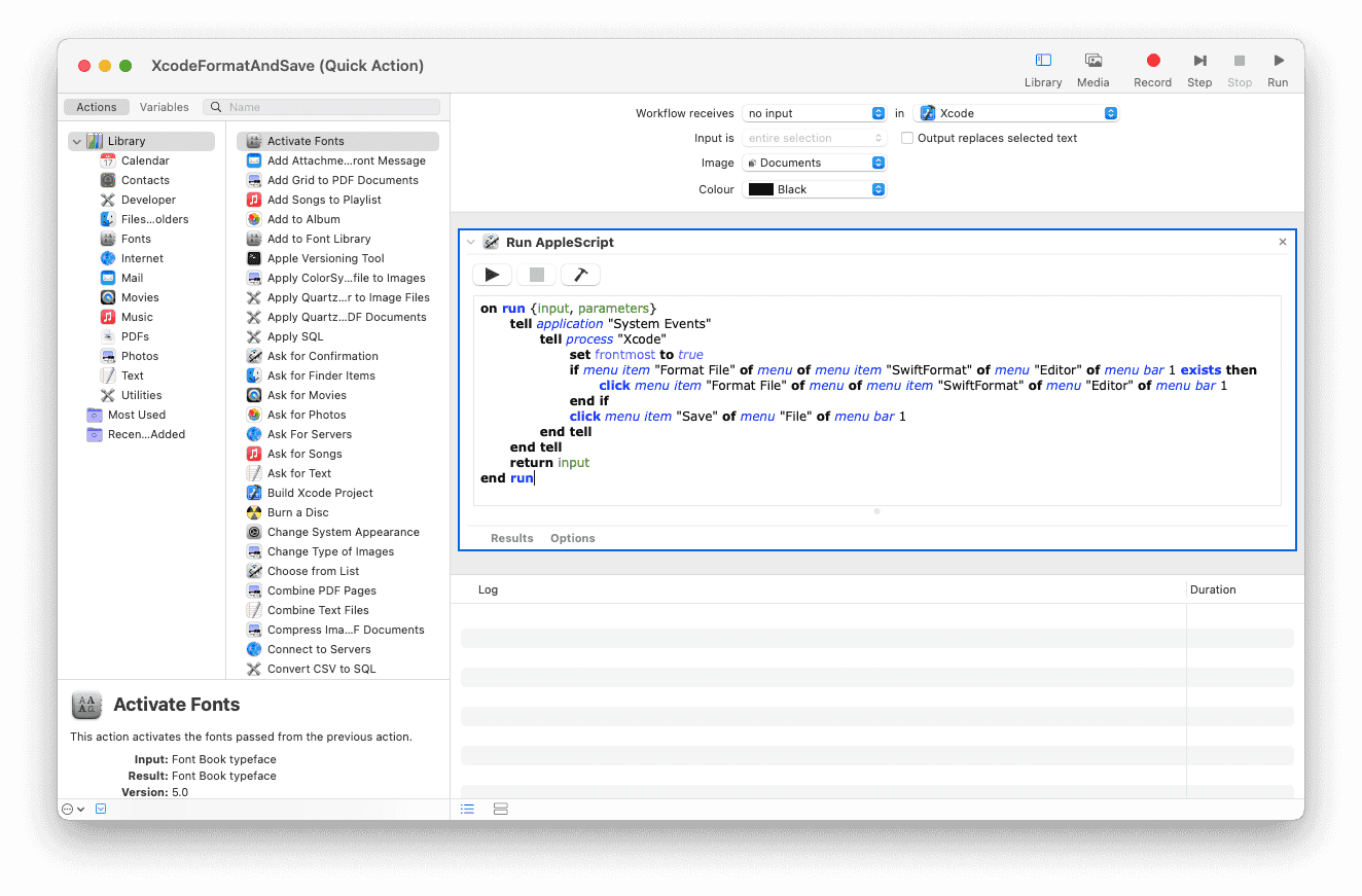 Save the Quick Action. Automator will place it directly into a macOS "Services" folder, and that will make it available in the "Xcode" > "Services" menu.